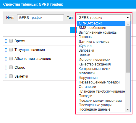 Для каждого типа таблицы предусмотрен свой набор столбцов, которые могут быть в нее включены. После того как тип таблицы выбран, перечень возможных столбцов отобразится ниже. Отметьте флажками те, которые вы бы хотели видеть в отчете. Чтобы выбрать одновременно все столбцы, нажмите кнопку Ctrl на клавиатуре и щелкните по любому пункту. Чтобы снять выделение, повторите то же самое действие. Эти комбинации работают и для дополнительных параметров отчетов, где нужно выбирать геозоны, события и т. п.