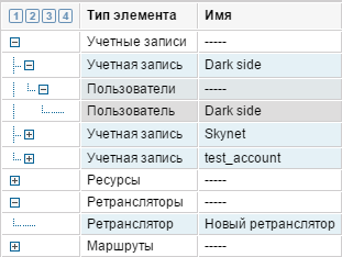 | Тип элемента | Учетные записи, ресурсы, пользователи, объекты, группы объектов, ретрансляторы, маршруты. |