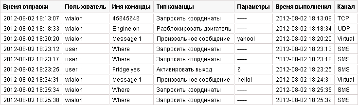 | Канал | Тип связи, который был использован для выполнения команды: TCP, UDP, Virtual, SMS. |