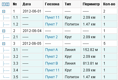 Ниже приводится отчет за пять рабочих дней с 1 по 5 июня, из которого следует, что 1 июня остались без внимания 7-ой и 11-ый пункты, 4 июня — 2-ой пункт, а 5 июня — целых пять пунктов. Отсутствие в этом списке чисел 2 и 3 июня свидетельствует о том, что все положенные зоны были в эти дни посещены. Ячейки с названиями геозон подсвечиваются синим цветом, что позволяет по клику переместиться к первой точке геозоны на карте.