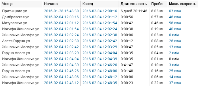При щелчке по синей строке в таблице на карте можно переместиться к месту, где объект попал на улицу или покинул нее, или где была достигнута максимальная скорость.