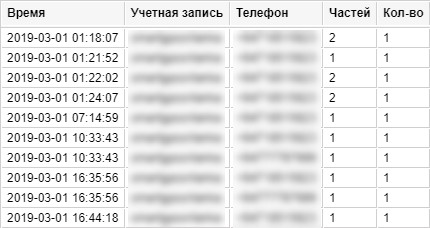 Этот отчет предназначен для просмотра информации по всем SMS-сообщениям, отправленным пользователями того или иного ресурса за указанный временной интервал. Отчет может содержать столбцы, описанные ниже.