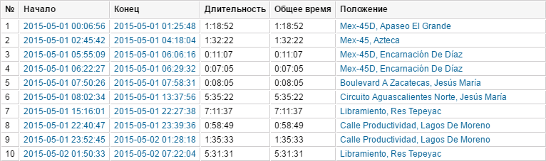 | Положение | Адрес, по которому находился объект в течение всей стоянки. Если было определено незначительное перемещение, то в качестве адреса стоянки указывается начальное местоположение объекта. Если на интервале стоянки местоположение объекта недоступно, то оно определяется по его начальному местоположению в поездке, следующей после стоянки. |