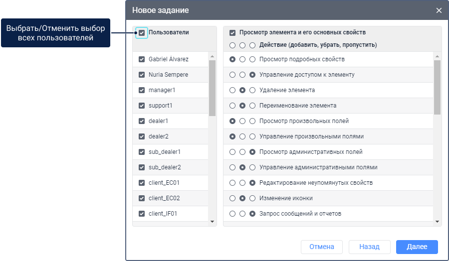 Чтобы создать задание этого типа, следуйте инструкции по созданию заданий. На шаге 4 выберите пользователей и установите для них новый набор прав следующим образом: