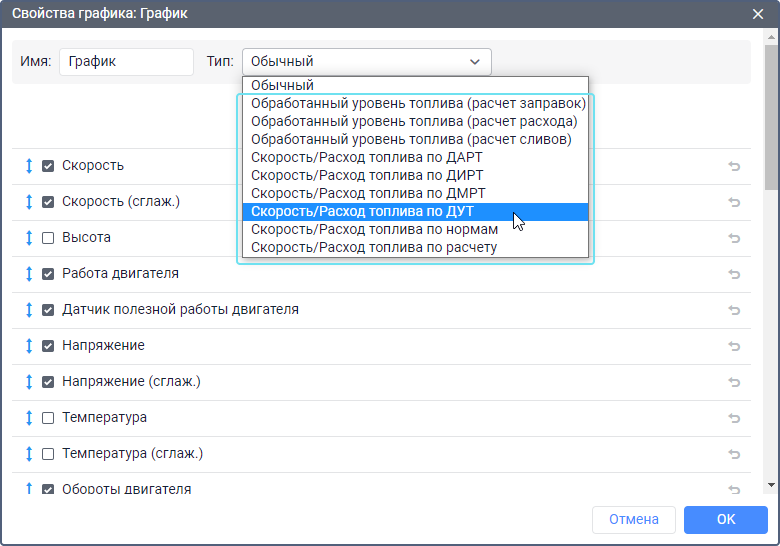 Среди графиков типа Обычный доступно два графика уровня топлива.