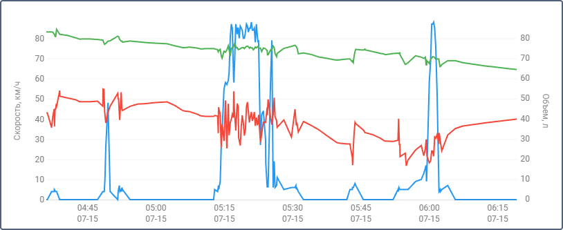 График показывает зависимость среднего расхода топлива от скорости движения. Данные для него берутся из показаний датчиков расхода топлива (импульсных, абсолютных, мгновенных) или уровня топлива, из установленных норм расхода или по математическому расчету. Соответствующие методы расчета должны быть указаны в настройках необходимых датчиков.