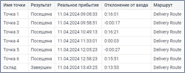 Под точками маршрута подразумеваются контрольные точки, которые были заданы при создании маршрута. Таблица может включать колонки, описанные ниже.