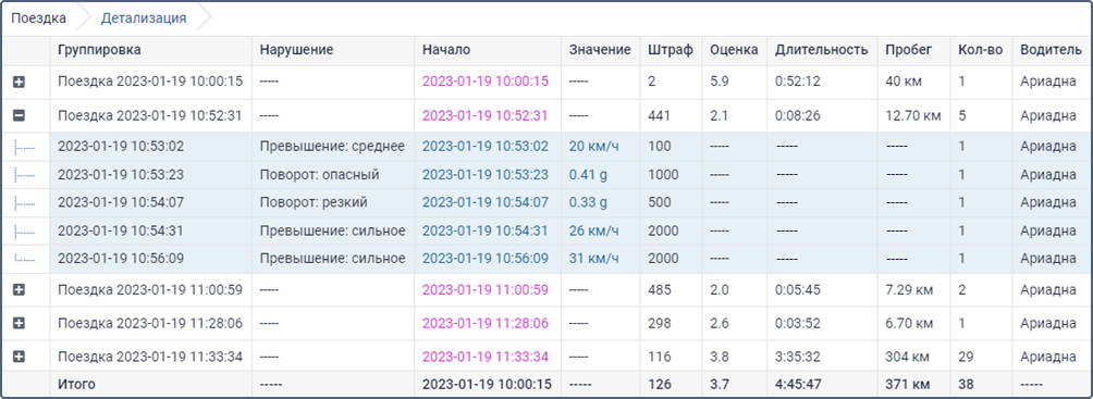 Кроме того, в дополнение к группировке может быть применена опция детализации, которая позволит просмотреть конечный уровень вложенности группировки (дата и время). Однако необходимо учитывать, что выставить штраф или оценку можно за нарушение, которое происходило на определенном интервале времени (не одномоментно), поэтому на конечном уровне вложенности в колонке Оценка ставится прочерк, а в колонке Штраф показывается значение штрафа, выставляемое в свойствах объекта на вкладке Качество вождения.