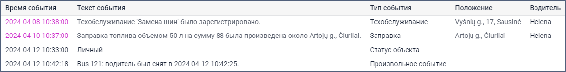 | Пользователь | Имя пользователя, который зарегистрировал событие. Если событие зарегистрировано автоматически, то показывается имя создателя ресурса, которому принадлежит уведомление или задание. Если тип события — прохождение маршрута, то показывается имя пользователя, создавшего маршрут. Имя пользователя скрыто при отсутствии прав доступа на его просмотр. |