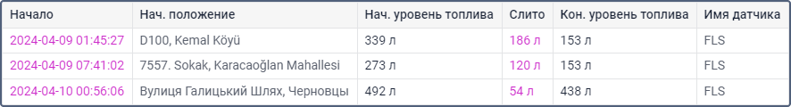 Эта таблица отчета позволяет предположить, где и когда с объекта могло сливаться топливо. Сливы топлива определяются во время стоянок и остановок, а также при движении объекта, если включена опция Поиск сливов в движении. О том, как правильно настроить параметры, используемые в отчете, читайте в настройках ДУТ.