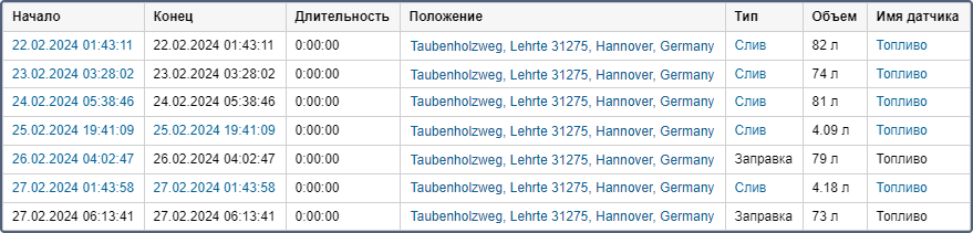 | Длительность | Время от начала до конца (0 для заправок и сливов). |