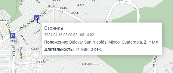 | Положение | Адрес, по которому находился объект в течение всей стоянки. Если было определено незначительное перемещение, то в качестве адреса стоянки указывается начальное местоположение объекта. Если на интервале стоянки местоположение объекта недоступно, то оно определяется по его начальному местоположению в поездке, следующей после стоянки. |