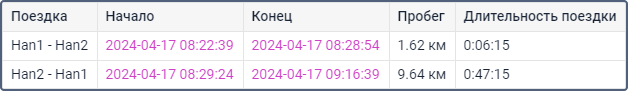 | Длительность поездки | Длительность перемещения из одной геозоны в другую. Может включать стоянки. |
