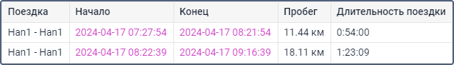 | Поездка | В этом столбце указываются начальная и конечная точка движения через дефис (имена геозон или объектов). |