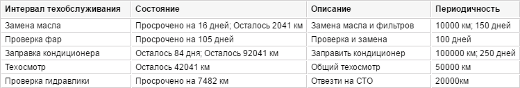 | Состояние | Общее состояние выполнения сервисных работ, другими словами, это оставшийся или просроченный интервал по пробегу, моточасам, дням. |