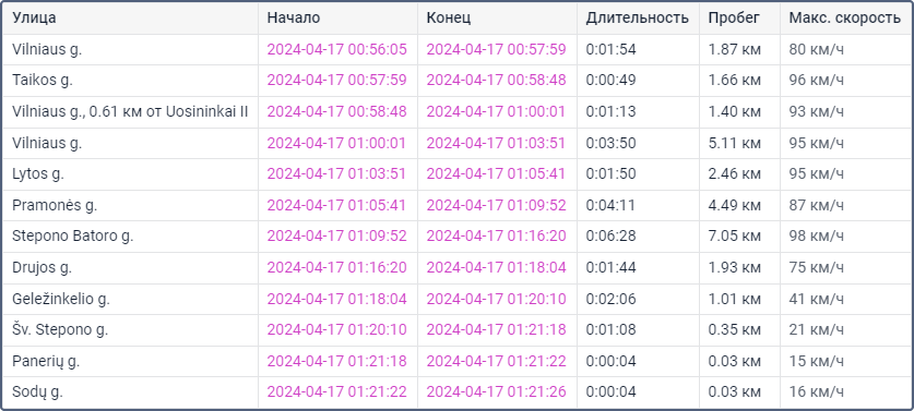 При щелчке по синей строке в таблице на карте можно переместиться к месту, где объект попал на улицу или покинул нее, или где была достигнута максимальная скорость.