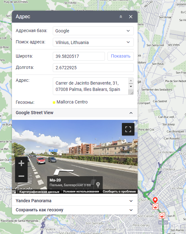 По щелчку на маркеры стоянок или остановок могут быть показаны панорамные снимки местности. Для этого в настройках пользователя выберите карты, в которых есть панорамы (например, Yandex Panorama или Google Street View). При наличии снимков местности с координатами маркера, вид курсора, наведенного на него, меняется со стрелки на руку. Нажатие на маркер открывает панорамный снимок в окне инструмента Адрес. Двойной щелчок по другому такому маркеру обновляет информацию.