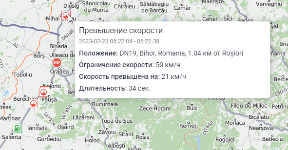 Превышение скорости | Время начала (то есть время прихода первого сообщения со значением скорости, превышающим допустимое), время окончания, длительность, адрес, ограничение скорости по методу, указанному в свойствах объекта, величина превышения скорости. |