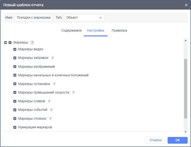 Для маркеров заправок, сливов, остановок, стоянок, превышений скорости и событий можно настроить фильтрацию (иконка