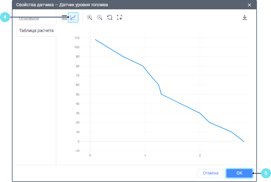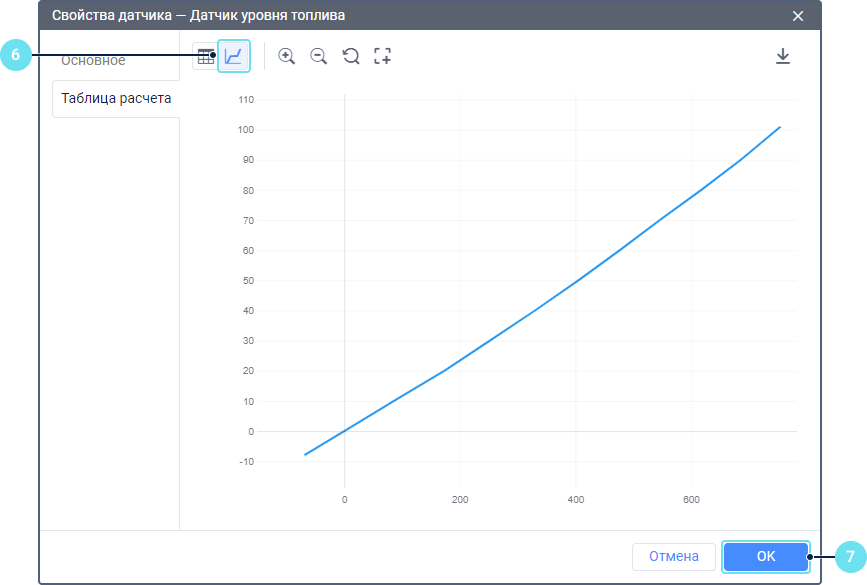 Перед настройкой таблицы расчета для ДУТ выполните тарировку топливного бака, чтобы получить таблицу, в которой значения X соответствуют показаниям датчика, а значения Y — объемам топлива.