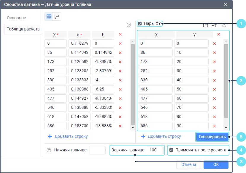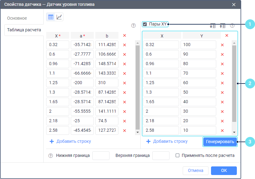 Включите инструмент Пары XY на вкладке Таблица расчета в свойствах датчика уровня топлива.