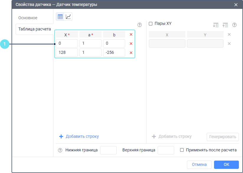 На вкладке Таблица расчета в свойствах датчика температуры добавьте две строки и укажите в них необходимые значения следующим образом: