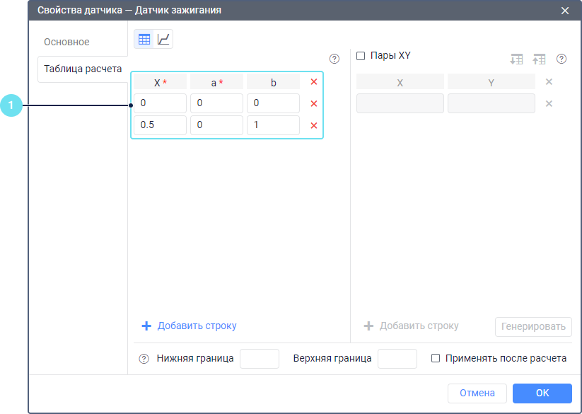 На вкладке Таблица расчета в свойствах датчика зажигания добавьте две строки и укажите в них необходимые значения следующим образом: