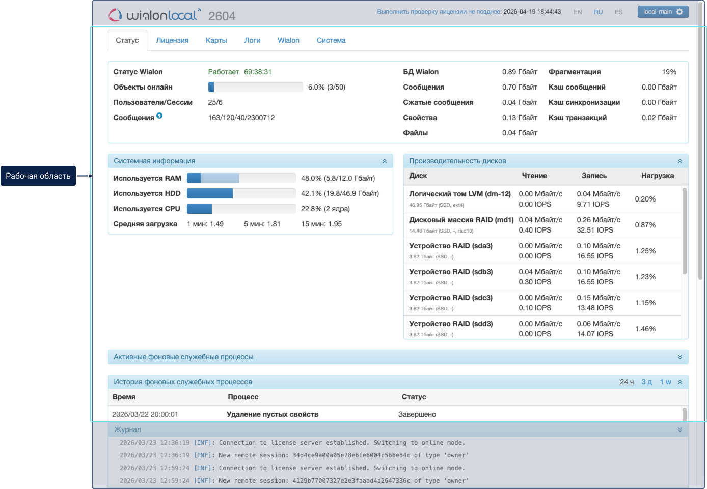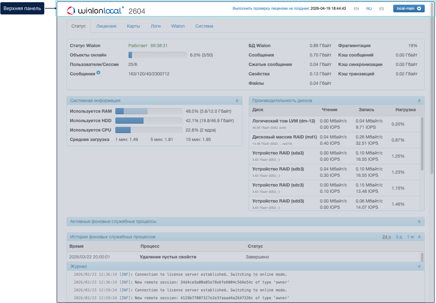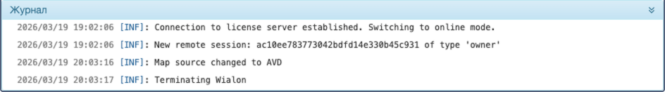 Журнал находится в нижней части экрана. В нем показывается информация о событиях, происходящих в Wialon Local. Например, о его запуске или остановке, наличии доступных обновлений, установке компонентов и т. д. При перезагрузке страницы из журнала удаляются все события.