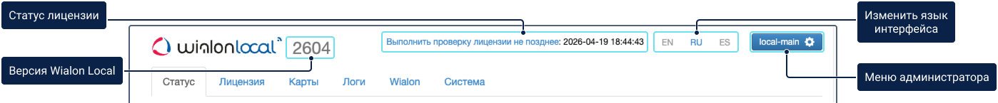 - Статус лицензии: показывает время до истечения срока действия лицензии или указывает, что срок её действия истёк. Цветовые индикаторы предупреждают о приближающемся или наступившем истечении срока. Подробнее см. в разделе Лицензия.