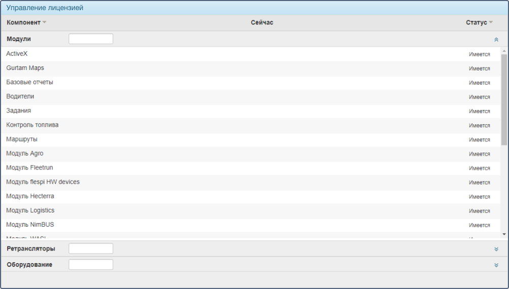 В этой секции содержится список видов оборудования, которые используются в системе. Все оборудование делится на группы в зависимости от производителя. Это означает, что, покупая оборудование “X”, вы приобретаете все типы оборудования компании “X”. Ознакомиться с полным списком поддерживаемого оборудования и другой полезной информацией можно на странице GPS-оборудование.