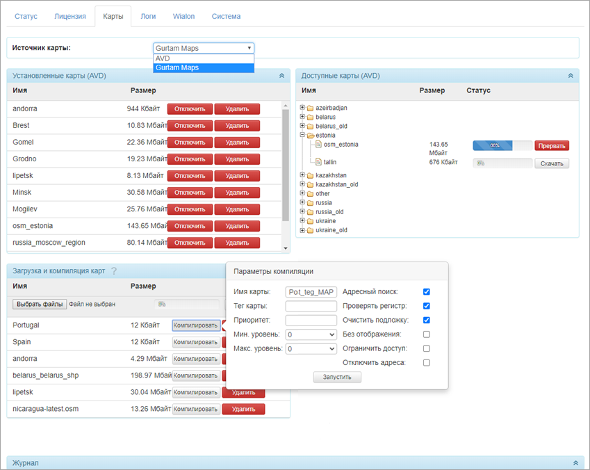 Для карты в любом другом формате после загрузки необходимо произвести компиляцию. После загрузки архива с исходными данными нажмите на кнопку Компилировать, настройте необходимые параметры и щелкните Запустить. О процессе компиляции можно судить по состоянию кнопки Компилировать/Удалить. Процесс компиляции завершен, если кнопка Удалить недоступна. Если карта скомпилирована успешно, она попадает в раздел Установленные карты. Информацию о том, как создавать карты AVD, можно найти здесь.