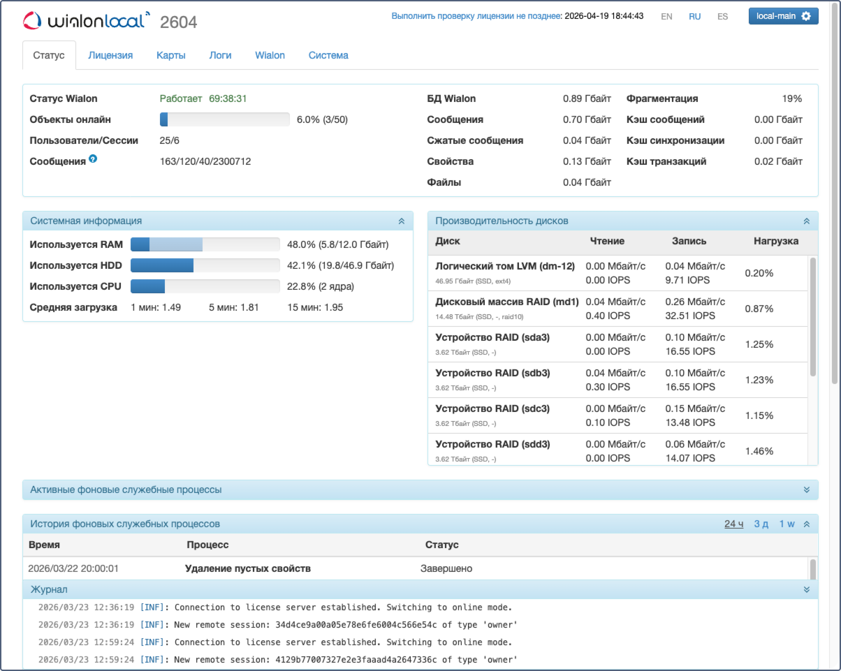 На этой вкладке представлена информация об основных параметрах работы сервиса в реальном времени.