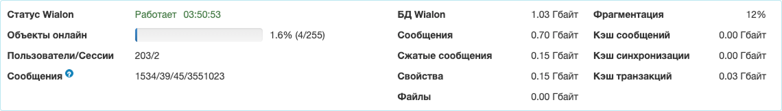 | Сообщения (размер) | Суммарный размер всех сообщений в базе данных Wialon. |