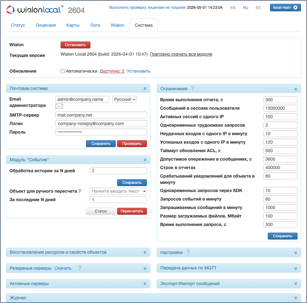 На этой вкладке можно вручную запустить/остановить Wialon Local, установить обновления, настроить сервер сообщений и установить важные ограничения.