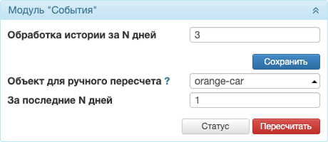 Модуль позволяет вручную запустить пересчет данных для какого-либо объекта за прошедший период. Для этого необходимо выбрать объект, указать период и нажать на кнопку Пересчитать.