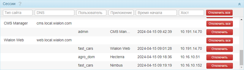 | Приложение | Имя приложения, с которым работает пользователь. Это могут быть как нишевые решения, использующие SDK сайта из колонки Тип сайта, так и сами сайты, предоставляющие SDK (Wialon Web и CMS Manager). |