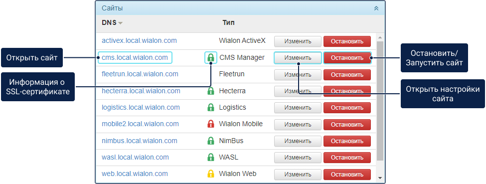 После запуска (перезапуска) Wialon Local все сайты также запускаются (перезапускаются) вне зависимости от их предыдущего состояния.