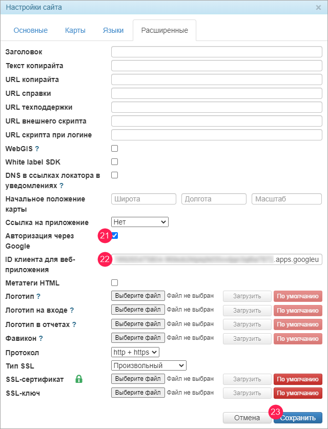 В системе администрирования на вкладке Wialon найдите сайт мониторинга (тип Wialon Web), для доступа в который вы хотите использовать авторизацию через Google, и нажмите на кнопку Изменить напротив его имени. На вкладке Расширенные настроек сайта включите опцию Авторизация через Google.
