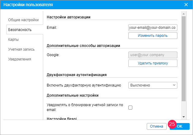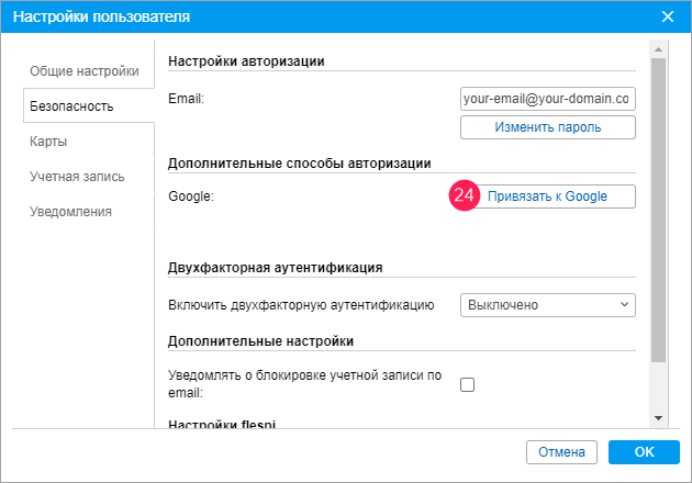 Авторизуйтесь на сайте мониторинга от имени пользователя, для которого необходимо настроить авторизацию через Google. В настройках пользователя на вкладке Безопасность нажмите на кнопку Привязать к Google.