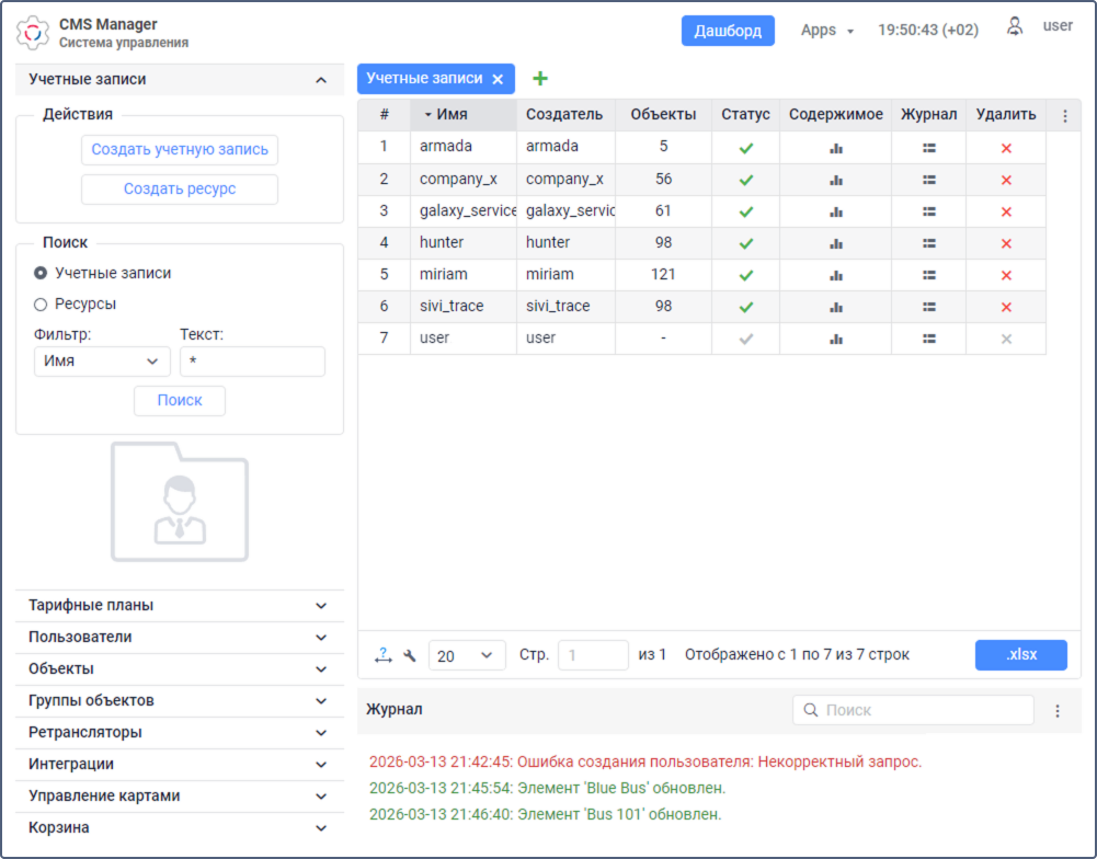 Частично эти же функции доступны и в системе мониторинга, но отличие CMS Manager состоит в том, что его интерфейс позволяет работать с большим количеством элементов одновременно, фильтровать их по разным параметрам, представлять в табличном виде с постраничным выводом, создавать закладки с результатами поиска. Кроме того, исключительной привилегией менеджера является возможность работать с учетными записями (и, соответственно, регулировать оплату, ограничивать услуги и задавать их стоимость), а также с ретрансляторами.