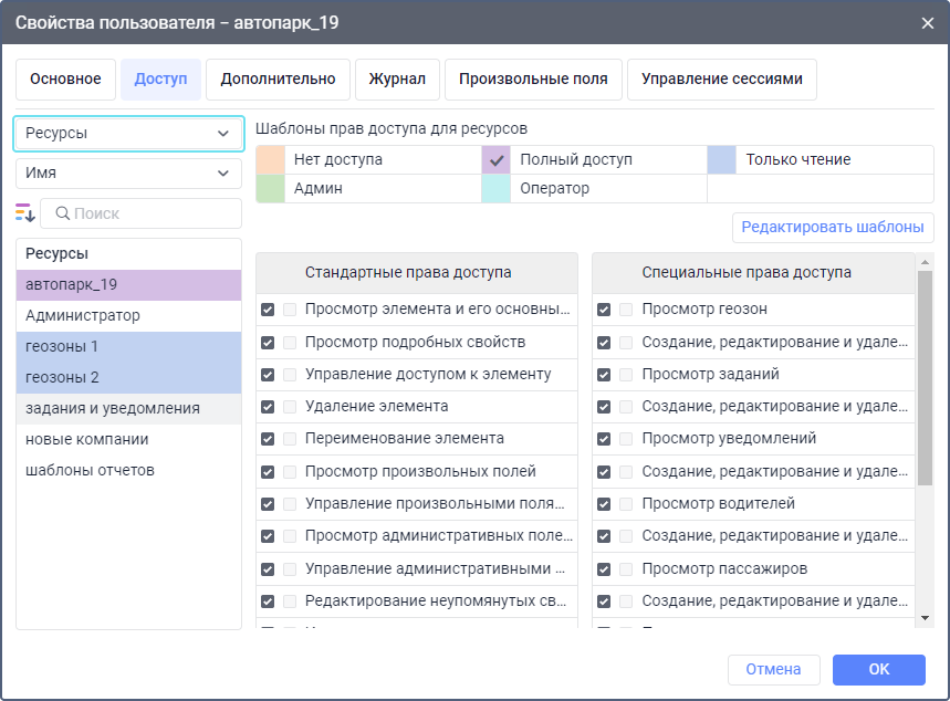 | Создание, редактирование и удаление шаблонов отчетов | Позволяет создавать новые шаблоны отчетов в ресурсе, редактировать и удалять шаблоны отчетов, принадлежащие ресурсу, а также отмечать заправки и сливы как ложные в таблицах или на графиках отчетов. |