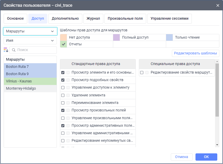 Кроме стандартных прав доступа, на маршрут можно предоставить специальное право Редактирование свойств маршрута. Оно позволяет копировать маршрут, а в сочетании с правом Просмотр подробных свойств — выполнять следующие действия: