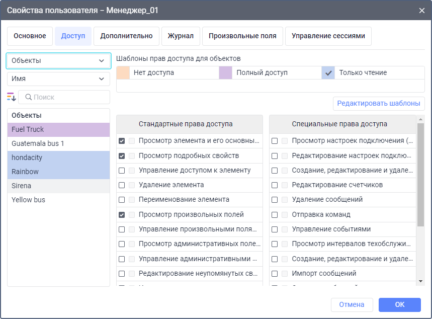 | Редактирование неупомянутых свойств | Позволяет редактировать разделы Цвет подписи к объекту, Цвет трека и Использование цветов датчика на вкладке Дополнительно. |