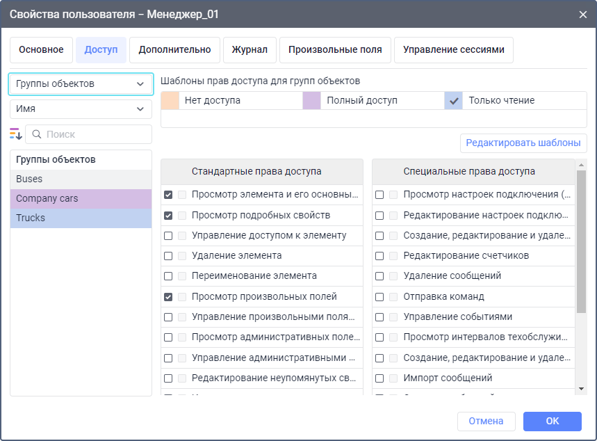 | Управление произвольными полями | Позволяет создавать, удалять, изменять общие произвольные поля в свойствах группы и входящих в нее объектов. Также позволяет редактировать содержимое вкладки Характеристики в свойствах объектов. Это право доступа действует только в сочетании с предыдущим. |