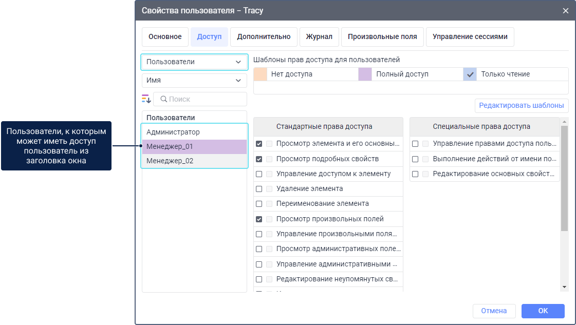 | Управление правами доступа пользователя | В свойствах пользователя показывается вкладка Доступ, где можно предоставлять пользователю права доступа на элементы системы. Также пользователь показывается в свойствах элементов в списке пользователей, которым можно предоставлять права доступа. Кроме того, это право необходимо, чтобы автоматически изменять доступ пользователя на объекты с помощью уведомлений и заданий. |