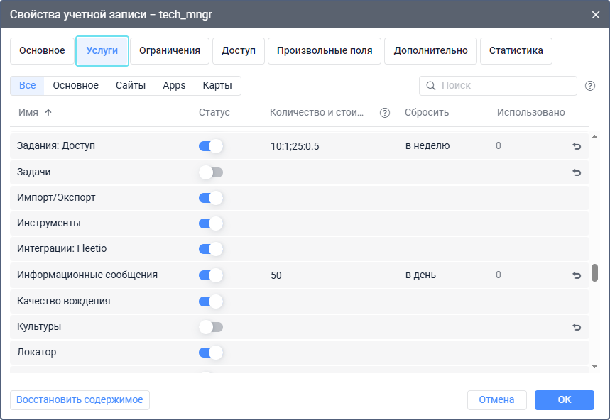 Услуги в этой группе активируют основной функционал Wialon, такой как Качество вождения, Система управления (CMS Manager), Объекты и другие. Здесь вы можете включить или отключить услугу, настроить параметр Количество и стоимость и выбрать период сброса.