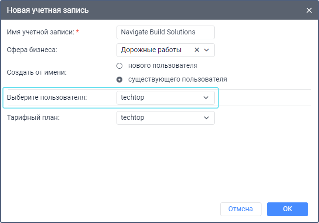 | Выберите пользователя | Этот параметр доступен при создании учетной записи от имени существующего пользователя. Здесь необходимо выбрать пользователя, который должен считаться ее создателем. Для выбора доступны только те пользователи, в свойствах которых включена опция Может создавать элементы. Если выбранный пользователь ужé является создателем макроэлементов системы, то поле Тарифный план становится неактивным и учетную запись создать нельзя, так как это может нарушить иерархию. Однако такого пользователя можно указать в качестве создателя ресурса. Если у создателя выбранного пользователя нет прав дилера, учетную запись создать нельзя. |