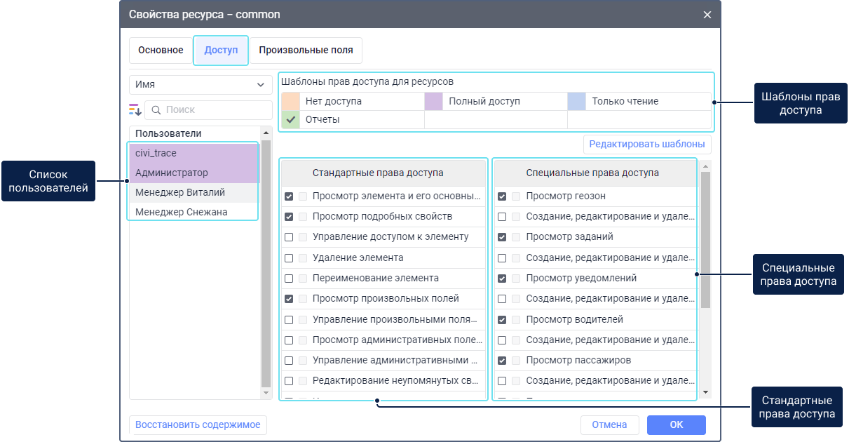 Для работы со вкладкой Доступ необходимы следующие права доступа: