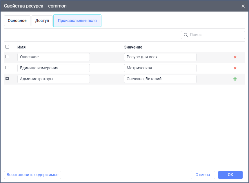 На этой вкладке можно создать произвольные поля с дополнительной информацией о ресурсе.