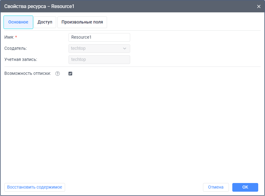 | Создатель | Пользователь, от имени которого создан ресурс. Для ресурса нельзя изменить создателя. |